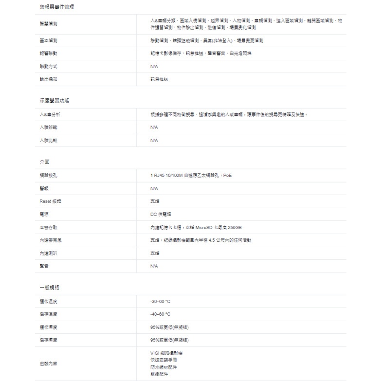 【此組合為 VIGI NVR1004H-4P 4路 PoE+ 網路監控主機(NVR)+VIGI C350 5MP 戶外全彩紅外線槍型網路攝影機 2支】主機-4K HDMI 影像輸出 和 16MP 解碼能力: 提供高達 8MP 的更清晰影像解析度以及 4 路畫面顯示,確保您可以從任何角度捕捉所有細節。-透過 PoE+ 讓安裝更簡單: 透過一條 RJ45 網路線連接您的 PoE 攝影機,便能同時傳輸電源和資料,讓攝影機無須另外連接變壓器。-4 路同時回放: 同時最多可回放 4 台攝影機、增加回放速度並在排程中輕鬆查看影像紀錄。-H.265+: 攝影機可以傳輸壓縮過的超清晰影像,不佔用額外頻寬並節省硬碟空間,減輕網路負載,在減少監控成本的同時不犧牲影響品質。-ONVIF 確保相容性: 從 VIGI 輕鬆新增所有支援 ONVIF 協定的攝影機,建立強大且多樣的網路影像。-隨插即用: 允許新拆封尚未使用的 VIGI 攝影機自動新增至 NVR,讓您接線即使用,體驗前所未有的快速安裝。-24/7 全天持續錄製: 儲存所有連線的攝影機影像,提供更快、更方便的存取。-遠端監控: 獨家 VIGI app、網頁介面和 VIGI Security Manager 讓便利的遠端監控不是夢,無論何時何地都能觀看即時影像和回放。-雙向語音: 支援對講功能,無論在哪,當您觀看即時影像時都能進行雙向溝通。-80 Mbps 影像存取頻寬: 高影像存取頻寬確保您的 NVR 使用高解析度管理更多攝影機。根據實驗室測試使用 VIGI 攝影機搭配 VIGI NVR,可管理最多四台 4MP 攝影機。攝影機-5MP 超高解析度:攝影機提供高達 5MP 的影像–更高畫質提供更細節的影像-24h 全彩畫面:即便在漆黑的環境中,透過高靈敏度感應器和內建的補光燈,也能取得 24 小時全彩細節。-人及車分類:辨識人像和車輛,讓您可以接收更準確的事件通知。-智慧偵測:主動偵測異常事件,如區域入侵和越界,並立即向您發送通知。-人及車分析:透過特徵快速尋找感興趣的人和車輛,提高搜尋效率。-主動防禦:當有異常事件時,立即以聲音及燈光警示潛在的入侵。-雙向語音:藉由語音對話功能,在觀看任何地點的畫面時進行雙向對話。-IP67 防水防塵:可靠的 IP67,確保穩定的戶外效能。-H.265+:在不影響影像品質的情況下壓縮視訊大小,減輕網路負載並節省磁碟空間。-強化智慧影像:VIGI 處理視訊的專業技術,高度提升監控所需的質量,包括智慧IR、True WDR、3D DNR 和夜視等功能。-彈性管理及儲存:透過四種管理方式全面掌控您的環境安全,包含網頁介面、 NVR 監控主機介面、 VIGI App 以及 VIGI Security Manager 軟體管理程式。每種方式都能進行本地存取,也能將記憶卡放在 SD 卡槽中進行儲存 (最高支援 256 GB)。