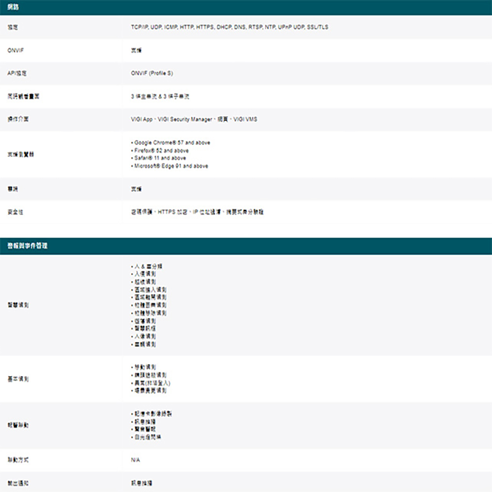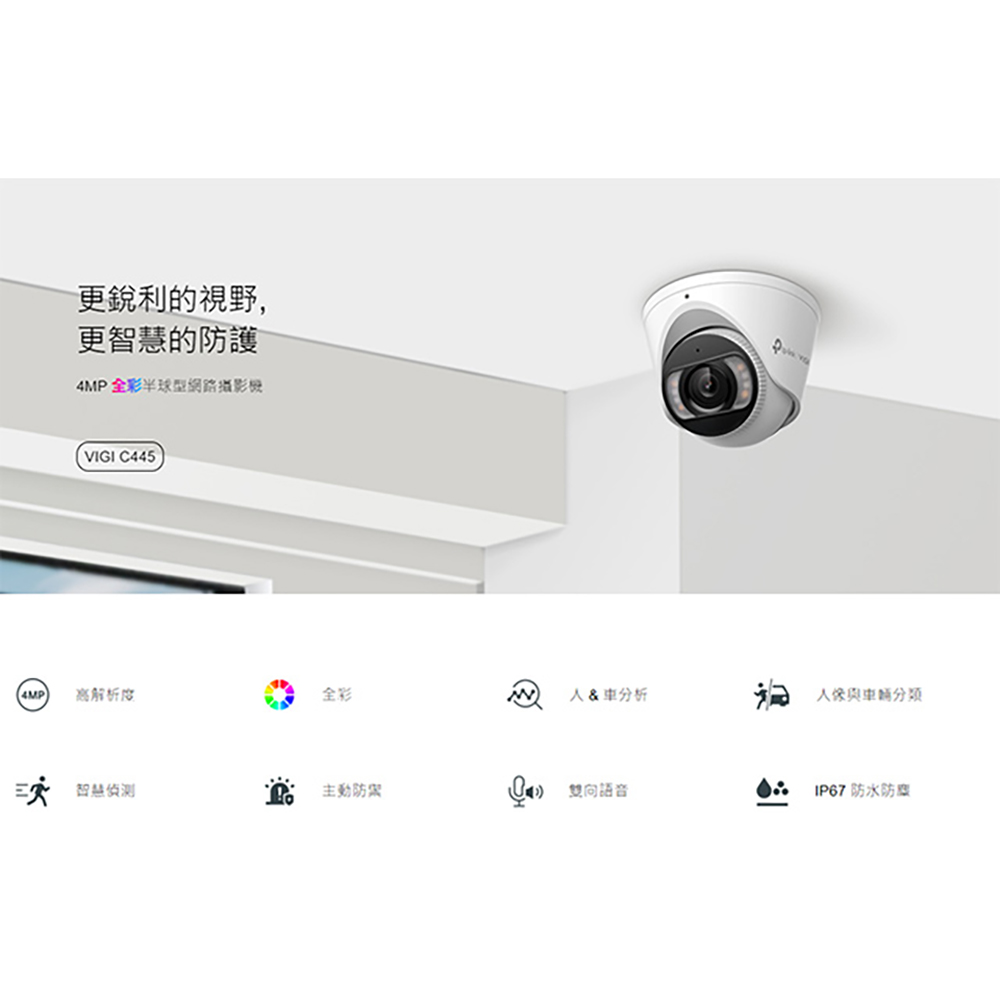 主機 -4K HDMI 影像輸出及16MP 解碼能力: 提供高達 8 MP 更清晰的影像解析度,以及 8 路 2 MP的解碼能力,讓您可以同時享用更多頻道的即時畫面及回放。 -140 W PoE 供電: 16個 802.3af/at 標準的 PoE+ 連接埠,提供 140W 電力供應。 -16 路同時回放: 同時最多可回放 16 台攝影機、增加回放速度並在排程中輕鬆查看影像紀錄。 -H.25+: 攝影機可以傳輸壓縮過的超清晰影像,不佔用額外頻寬並節省硬碟空間,減輕-網路負載,在減少監控成本的同時不犧牲影響品質。 -ONVIF 相容性: 從 VIGI 輕鬆新增所有支援 ONVIF 協定的攝影機,建立強大且多樣的網路影像 -自初始化以快速設定: 只要點擊 "自動初始化" 即可對攝影機及硬碟進行基本設定,大大減少設定時間。 -7 天 24 小時連續錄製: 可儲存最多至 20 TB(1048儲存天數***)所有連線攝影機的影像,提供更快、更方便的存取。 -雙向語音: 藉由語音對話功能的支援,在任何地方您可逼退潛在的竊賊或入侵者。 -遠端監控: VIGI app 和用戶端工具使遠端監控更容易,提供更多便利性。 攝影機 -4MP 超高解析度和 24h 全彩 -人 及 車分析 -人像 及 車輛分類 -智慧偵測 -智慧影像加強技術 -主動防禦和雙向語音 -IP67 防水防塵 -H.265+ 壓縮技術