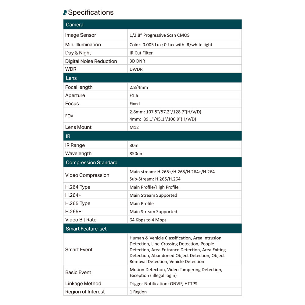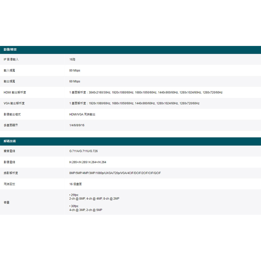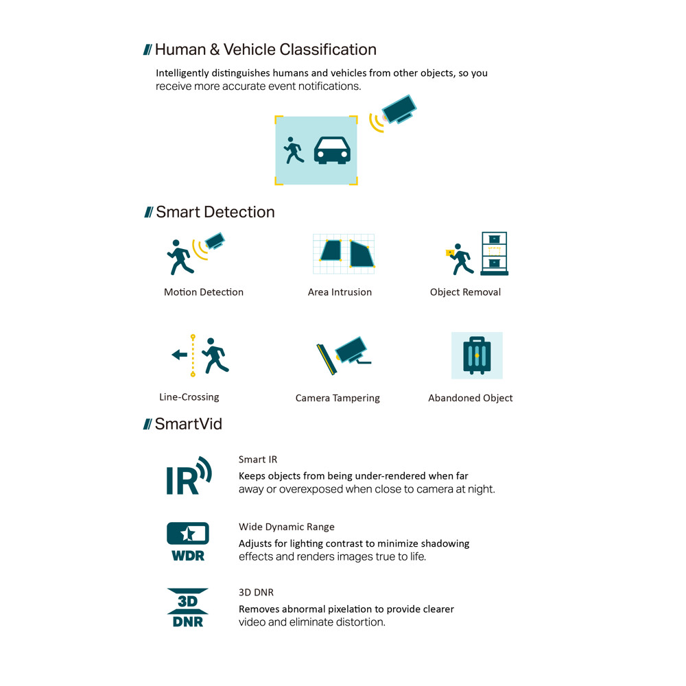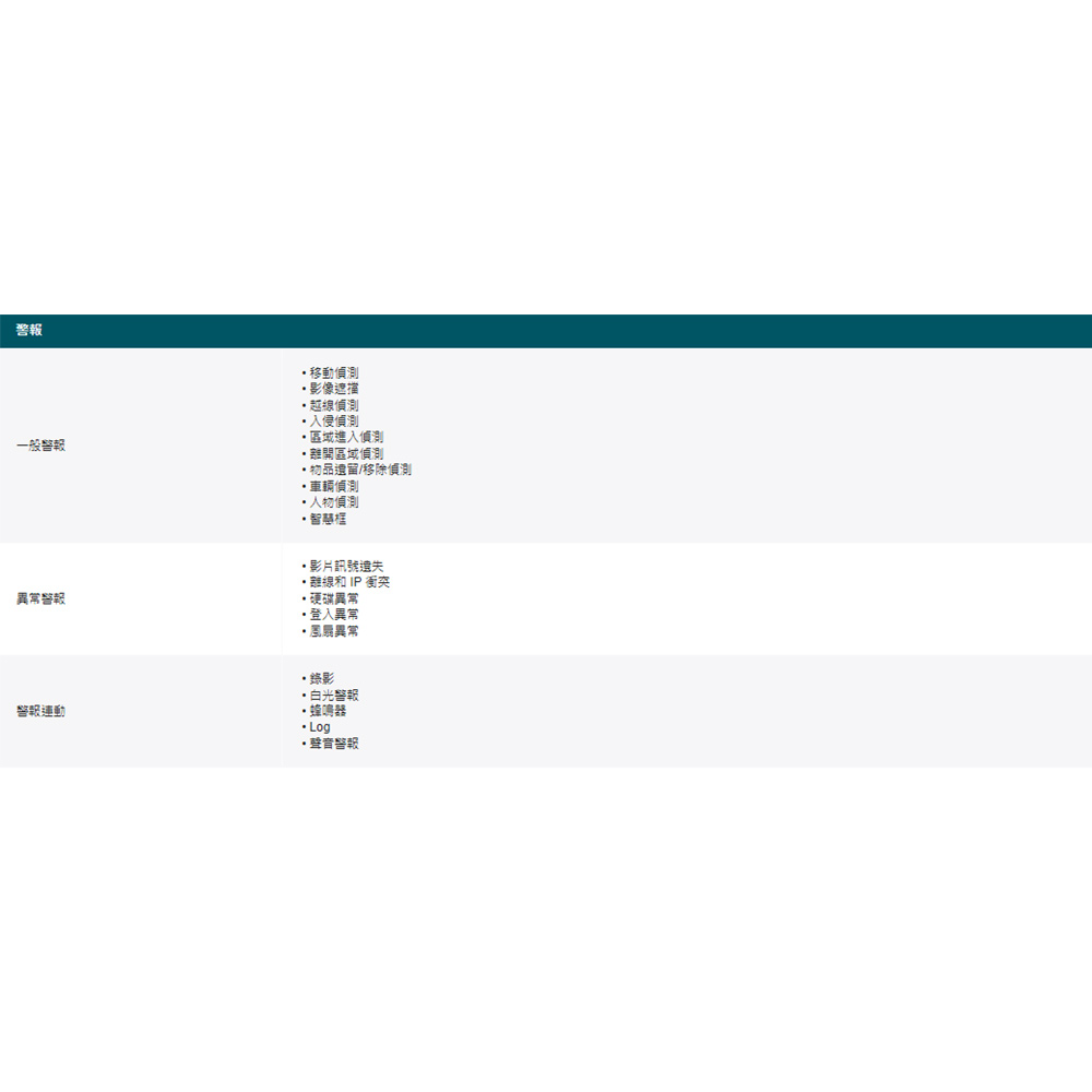 主機 -4K HDMI 影像輸出及16MP 解碼能力: 提供高達 8 MP 更清晰的影像解析度,以及 8 路 2 MP的解碼能力,讓您可以同時享用更多頻道的即時畫面及回放。 -140 W PoE 供電: 16個 802.3af/at 標準的 PoE+ 連接埠,提供 140W 電力供應。 -16 路同時回放: 同時最多可回放 16 台攝影機、增加回放速度並在排程中輕鬆查看影像紀錄。 -H.25+: 攝影機可以傳輸壓縮過的超清晰影像,不佔用額外頻寬並節省硬碟空間,減輕-網路負載,在減少監控成本的同時不犧牲影響品質。 -ONVIF 相容性: 從 VIGI 輕鬆新增所有支援 ONVIF 協定的攝影機,建立強大且多樣的網路影像 -自初始化以快速設定: 只要點擊 "自動初始化" 即可對攝影機及硬碟進行基本設定,大大減少設定時間。 -7 天 24 小時連續錄製: 可儲存最多至 20 TB(1048儲存天數***)所有連線攝影機的影像,提供更快、更方便的存取。 -雙向語音: 藉由語音對話功能的支援,在任何地方您可逼退潛在的竊賊或入侵者。 -遠端監控: VIGI app 和用戶端工具使遠端監控更容易,提供更多便利性。 攝影機 -3MP 超高解析度 與 24h 全彩 -人 & 車分類 -智慧偵測 -智慧影像強化 -內建麥克風 -H.265+ 壓縮技術 -遠端管理