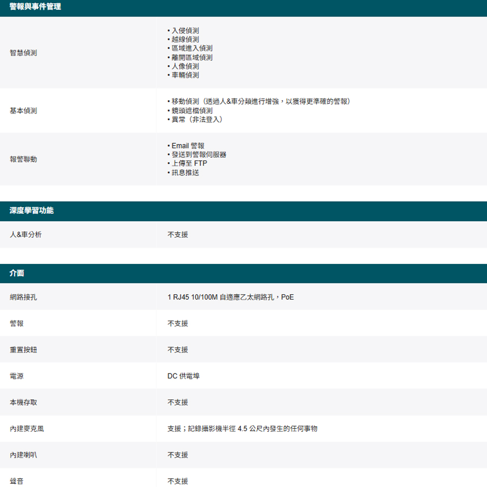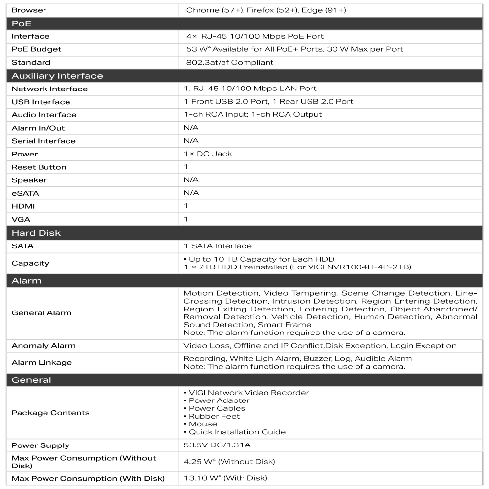 S3252MP 高畫素 和 24h 全彩LightPro 夜視人 & 車分類智慧偵測智慧影像強化技術內建麥克風IP67 防水防塵H.265+ 壓縮技術NVR1004H-4P4 路即時查看 與 4K HDMI 影像輸出4 × 10/100 Mbps PoE+ 連接埠,53 W PoE 供電△高達 2-ch @ 8MP (25fps) / 4-ch @ 4MP (30fps) 解碼能力4 路同時回放†80 Mbps 輸入頻寬 及 60 Mbps 輸出頻寬1 × SATA 介面和 1 最高支援 16 TBH.265+ 壓縮技術HDMI 和 VGA 同時輸出遠端監控