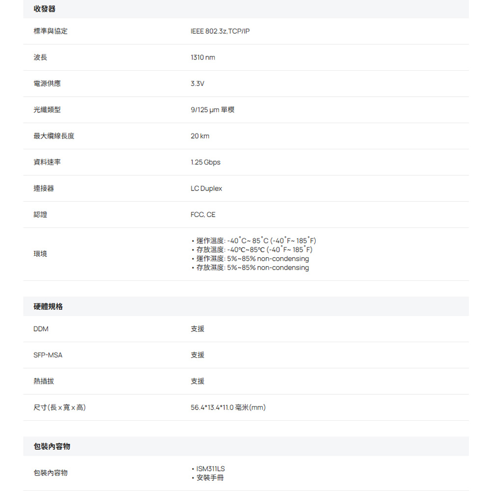 ISM311LS 是一款工業級 SFP 模組,是為了延長傳輸距離而推出的。安裝於我們的工業級交換器中,距離可以延長至 20 公里。使用者可根據具體需求選擇光纖模組來做使用。