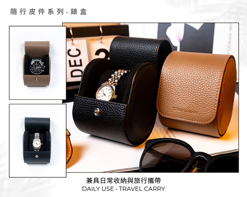 輕巧隨行,專為旅人打造的質感收納配件!【商品特色】●選用真皮(牛皮),觸感細膩、耐磨抗刮,隨著使用時間更添風格質感●可折式錶枕,穩固保護腕錶,不鬆動●金屬扣開闔,取放便利,適合旅行與日常,不再擔心手錶收納顏色: 大象灰、靜夜黑*商品圖檔顏色因電腦螢幕設定差異會略有不同,以實際商品顏色為準。