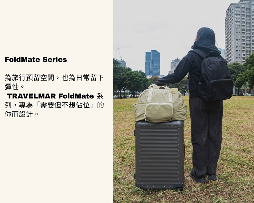 出門時輕盈俐落,回程時收納驚喜。TRAVELMAR FoldMate 系列專為「需要但不想佔位」的你而設計。無論是出國備用袋、健身運動包,還是日常通勤,都能在簡約中展現你的質感生活態度。