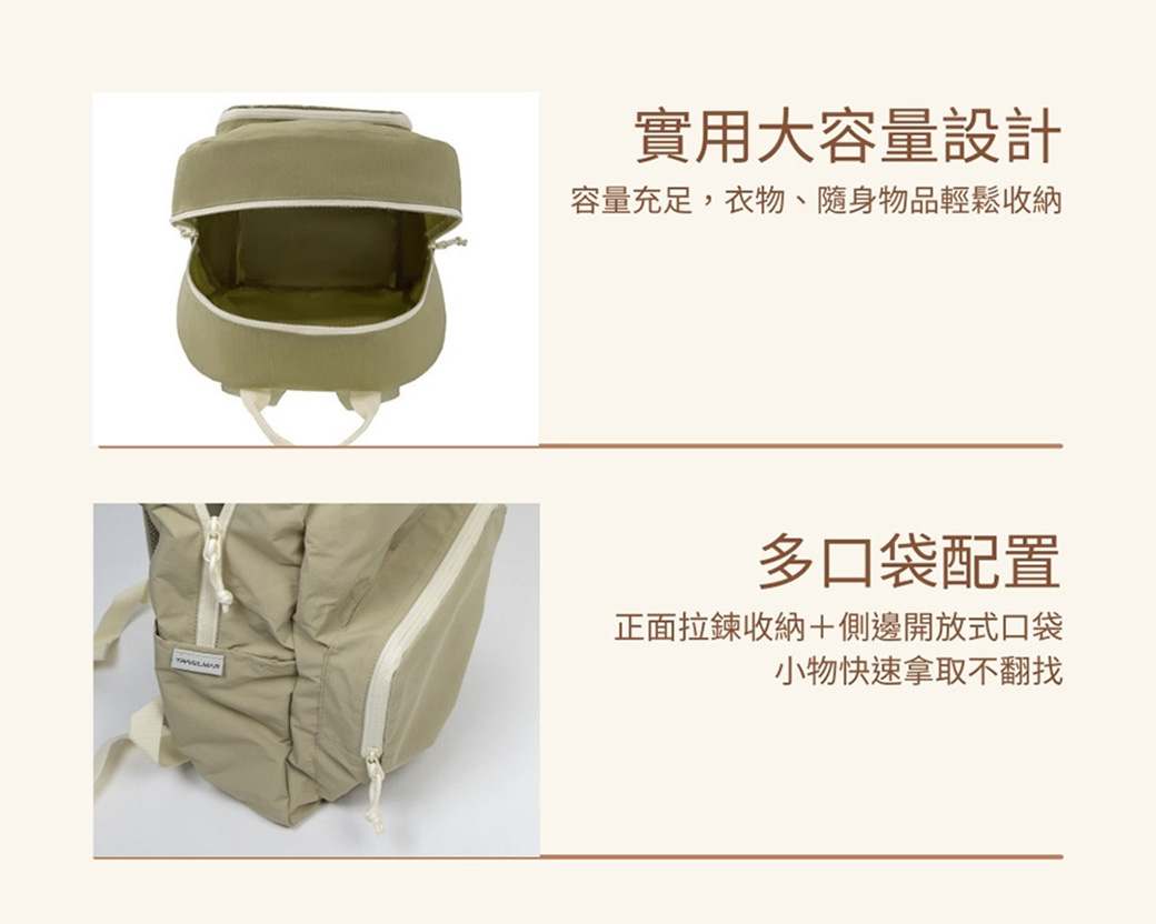 實用大容量設計:約 18L 的充足容量,輕鬆收納衣物、相機、平版與各類隨身小物。