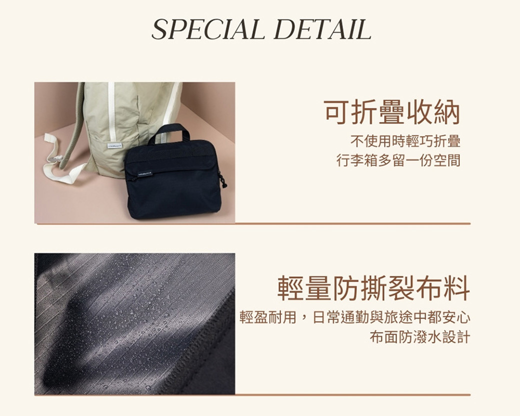 輕量防撕裂布料:採用高品質聚酯纖維布料,耐用不厚重。表面具備防潑水功能,無論是日常通勤或戶外旅途,都能安心守護包內物品。