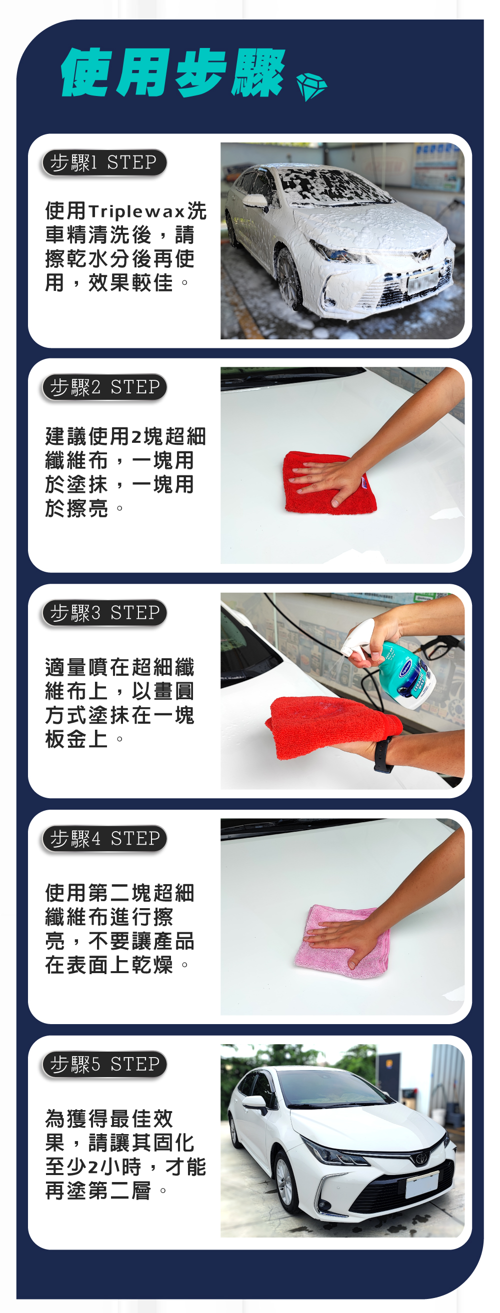 商品介紹‧ SiO2和蠟的混合物可形成強大的疏水珠層。‧ 防止漆面產生旋渦痕跡、油影和氧化。‧ 比傳統車蠟更出色,提供持久的光澤。‧ 塗施作後為漆面提供強大的保護。使用方式1.使用Triplewax洗車精清洗後,請擦乾水分後再使用,效果較佳。2.建議使用2塊超細纖維布,一塊用於塗抹,一塊用於擦亮。3.適量噴在超細纖維布上,以畫圓方式塗抹在一塊板金上。4.使用第二塊超細纖維布進行擦亮,不要讓產品在表面上乾燥。5.為獲得最佳效果,請讓其固化至少2小時,才能再塗第二層。