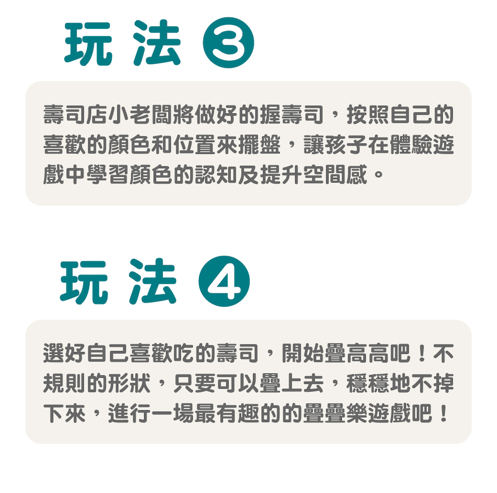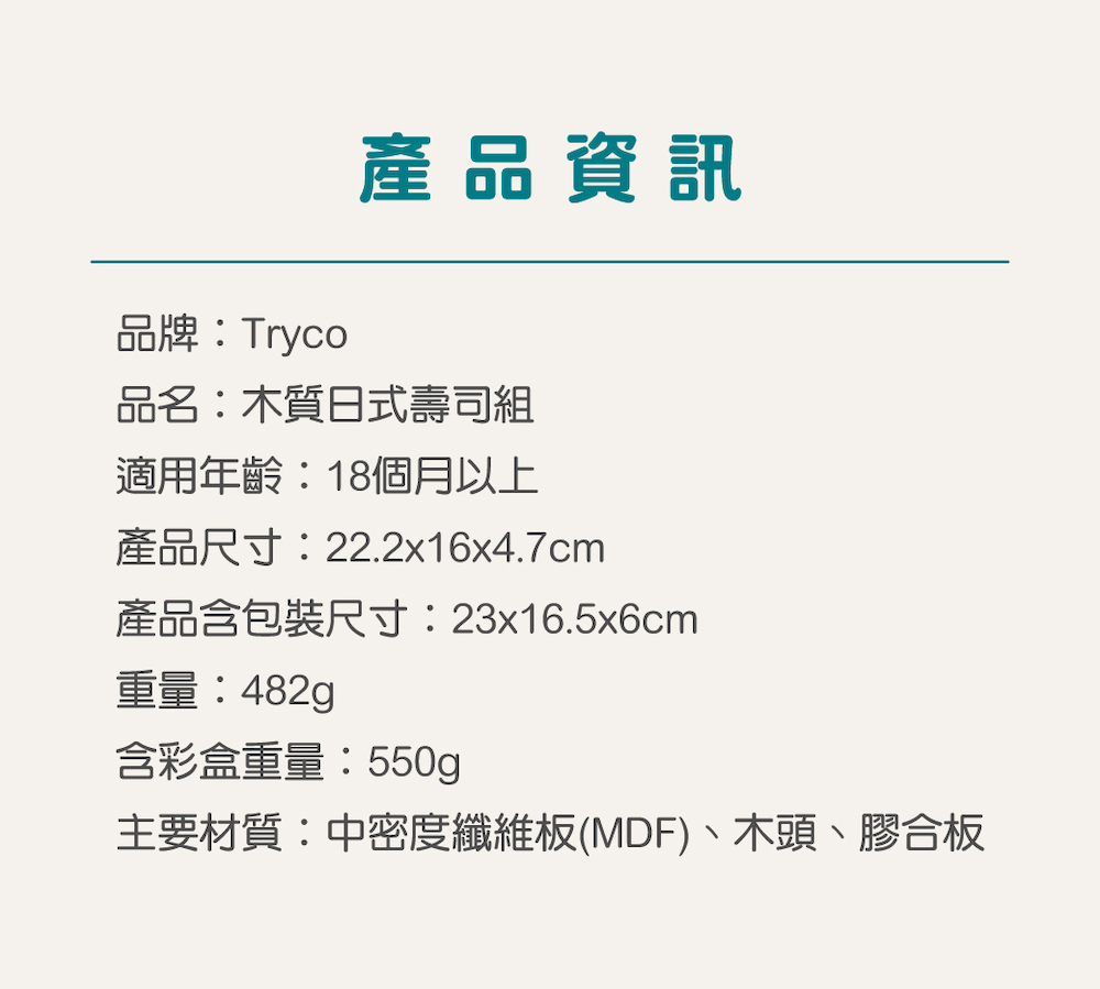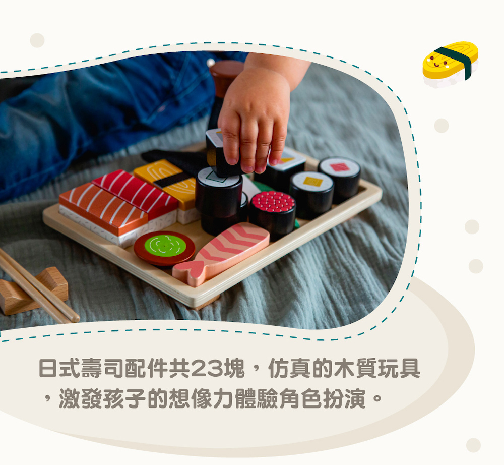 尺寸:22.2x16x4.7cm重量:482g材質:中密度纖維板(MDF)、木頭、膠合板產地:中國●歡迎來到日式壽司料理店,這位客人想要握壽司、軍艦壽司還是手捲呢?●互動式學習:跟師傅點餐唷!握壽司想吃玉子燒口味嗎?軍艦壽司我們推薦鮭魚子、手捲可以吃清淡一點的蘆筍口味。●完成餐點後,把餐盤上壽司端給客人,並附上筷子、醬油及芥末。●日式壽司配件共23塊,仿真的木質玩具,激發孩子的想像力體驗角色扮演●手捲的內餡依照客人挑選的口味捲起來,訓練手部小肌肉●學習主題:手部肌肉/形狀/顏色/角色扮演