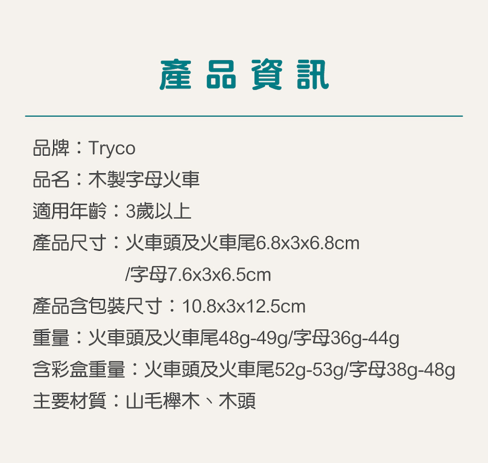 尺寸:7.6x3x6.5cm重量:37g材質:山毛櫸木、木頭產地:中國●噗噗!ㄑㄧㄥ ㄑㄧㄤ!ㄑㄧㄥ ㄑㄧㄤ!一列列的火車正開往下個幸福站牌●木製字母火車-此為單入賣場(最低購買"4個"以上出貨,敬請配合,謝)●每輛火車尾巴都有磁吸式設計,可自由組裝搭配●可依照火車上的字母,拼成英文單字,認識ABC字母●學習主題:手部肌肉/顏色/單字/發音材質:內含磁鐵警告,注意事項:1.本產品不適合3歲以下兒童使用,商品請在大人監督下使用2.不要將此產品放入口鼻中。此產品包含小的磁鐵,如果吞嚥或吸入磁鐵 立即尋求醫療救助。3.請遠離火源