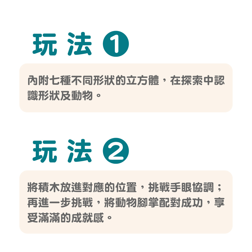 ●內附 7 種不同形狀的立方體。在探索中認識形狀及動物