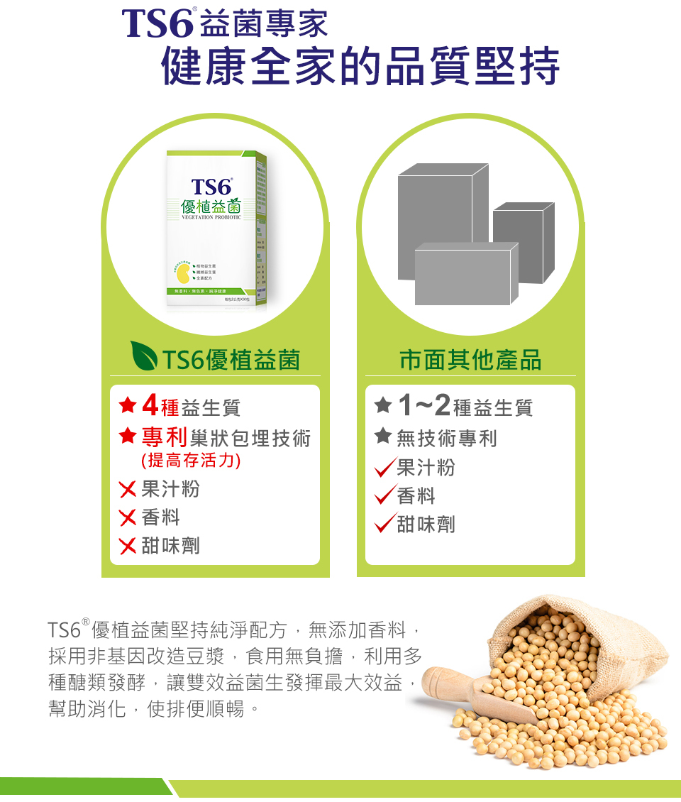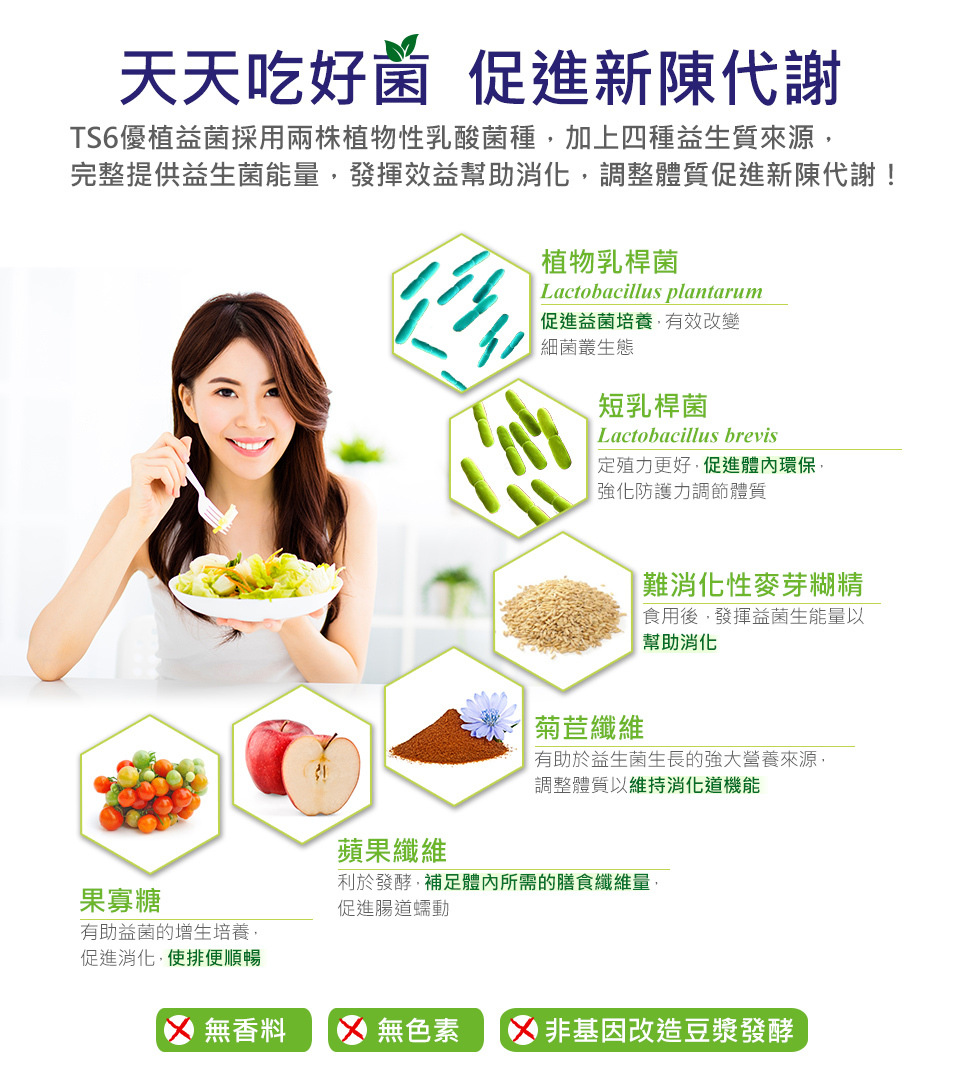 抗性澱粉、麥芽糊精、難消化性麥芽糊精、蘋果纖維、菊苣纖維、益生菌(非基因改造豆漿發酵): Lactobacillus brevis 短乳桿菌 Lactobacillus plantarum 植物乳桿菌 果寡糖、二氧化矽(抗結塊劑)、檸檬酸