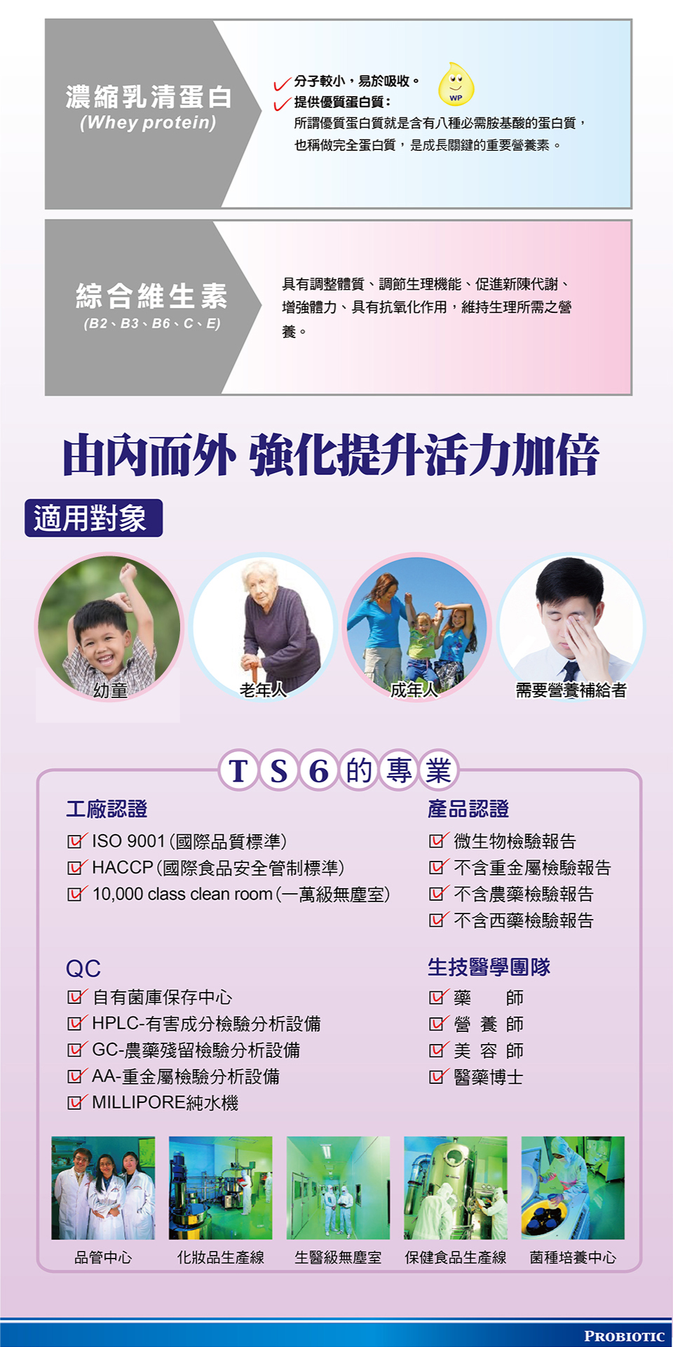 乳糖、麥芽糊精、益生菌: Bifidobacterium bifidum 雙叉雙歧桿菌(B菌) Bifidobacterium longum 長雙歧桿菌(L菌) Lactobacillus casei 乾酪乳桿菌(C菌) 蔗糖、草莓果汁粉、寡糖、機能性三蛋白: Whey protein濃縮乳清蛋白 Colostrum protein初乳蛋白 Lactoferrin 乳鐵蛋白 綜合維生素(B2,B3, B6, C, E)、接骨木莓萃取物、檸檬酸