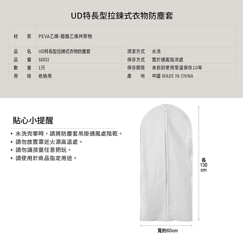 UD拉鍊式衣物防塵套S6032-12特長型