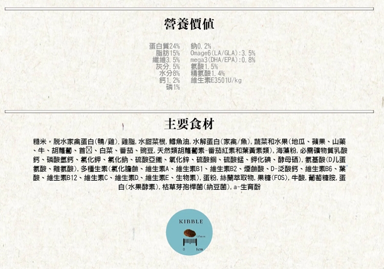 產地 台灣【嚴選食材】糙米、脫水禽肉(雞肉/鴨肉、軟骨素來源))、甜菜根、雞脂、水解蛋白(雞/魚)、三文魚油、蔬菜和水果(芝麻、地瓜、白菜、蘋果、山藥、牛蒡、胡蘿蔔、番茄、蔓越莓、豌豆、天然類胡蘿蔔素-番茄紅素、葉黃素類和葉綠素)、鮮雞蛋(卵磷脂)、礦物質、氨基酸(DL-蛋氨酸、L-賴氨酸)、維生素、魚膠原蛋白、海藻粉、絲蘭萃取物、果寡糖FOS、葡萄糖胺、磷蝦粉(蝦紅素來源)、蛋白(酵素)、枯草芽孢桿菌、金盞花萃取物、α-生育酚。【營養價值】蛋白質24%,脂肪15%,纖維4%,灰分7%,水分8%,鈣1.1%,磷0.9%,鈉0.2%,ω6 3.5%,ω3 0.6%,離氨酸1.5%,精氨酸1.8%,維生素E 250IU/KG卡路里(ME):3550Kcal/KG保存期限 18個月重量(kg) 10kg保存方式 避免放置潮濕處 、 避免放置太陽照射處 、 請儘快食用完畢鑑賞期並非試用期,本商品一經拆封使用,恕無法辦理退貨,退貨的商品必須為全新狀態且完正包裝,敬請見諒,商品請以實體為主 。