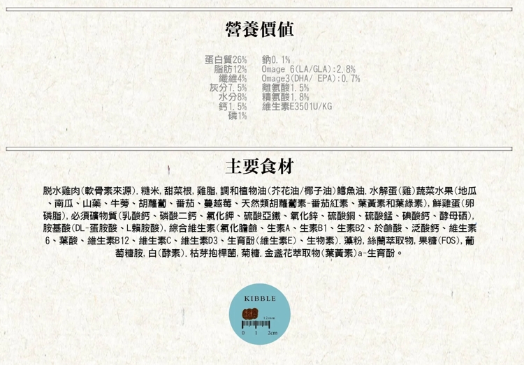 產地 台灣【嚴選食材】脫水雞肉(軟骨素來源)、糙米、甜菜根、雞脂、調和植物油(芥花油/椰子油)、鱈魚油、水解蛋白(雞)、蔬果膳纖(地瓜、南瓜、山藥、牛蒡、胡蘿蔔、番茄、蔓越莓、豌豆,天然類胡蘿蔔素-番茄紅素、葉黃素、玉米黃素、葉綠素)、鮮雞蛋(卵磷脂)、必須礦物質、胺基酸(DL-蛋胺酸、L-賴胺酸)、綜合維生素、海藻粉、絲蘭萃取物、多磷酸鈉、果寡糖FOS、牛磺酸、葡萄糖胺、蛋白(酵素)、枯草芽孢桿菌、菊糖、金盞花萃取物(葉黃素)、α-生育酚。參考添加量:ω6 2.8%、ω3 0.7%、離胺酸1.5%、精胺酸1.8%、維生素E 350IU/KG。【營養價值】蛋白質26%、脂肪12%、纖維4%、灰分7.5%、水分8%、鈣1.5%、磷1%、鈉0.1%。卡 路里(ME):3700Kcal/KG保存期限 18個月重量(kg) 10kg保存方式 避免放置潮濕處 、 避免放置太陽照射處 、 請儘快食用完畢鑑賞期並非試用期,本商品一經拆封使用,恕無法辦理退貨,退貨的商品必須為全新狀態且完正包裝,敬請見諒,商品請以實體為主 。