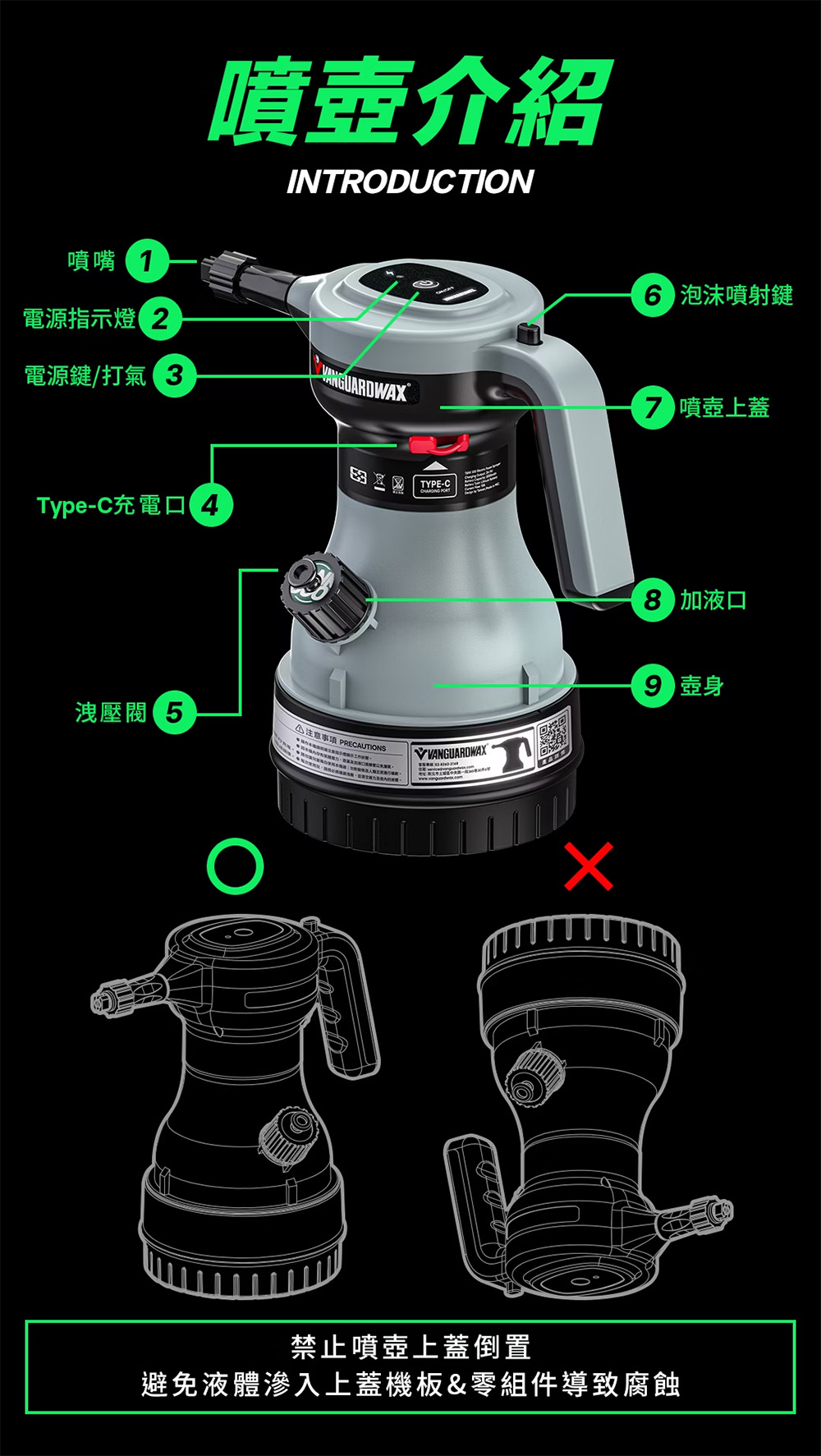 【注意事項】1.操作本機請明確注意指示燈顯示工作狀態。2.因本機內存有氣體壓力,壺蓋及加液口需擰緊以免漏氣,若有漏氣現象,請檢查密封圈是否鬆脫變形或未擰緊。3.本機充電電壓為DC5V,絕不能使用與其電壓不符的電源進行充電;電池充滿後請立即卸除插頭,不要長時間處在充電狀態中。4.使用過程中如發現機器一直加壓不會停止,應立刻關閉電源,以免壓力過大造成機器損壞。5.禁止使用有毒和有腐触性的液體進行噴灑作業(如酸洗劑、鐵粉劑、強酸鹼洗劑、易燃液體)。6.壓力壺內存有液體時,禁將本機器倒置存放。7.請勿讓兒童獨自使用本機器;勿對動物及人類五官進行噴射。8.每次使用完,請務必將機器洩壓,並清空壓力及壺內的液體。9.電池請勿長時間充電且盡量將電池保持在有電的狀態。鋰電池若沒電,又長時間放置無使用、會導致鋰電池因為電量過低而失效不能再使用。10.顯示(紅燈)時表示電力不足或可能有故障未排除。(請洽客服)。11.本產品已投保第一產物保險公司產品責任險新台幣2400萬元(保險金額非為理賠金額)。12.註冊線上保固後,馬達、電池非人為因素損壞享一年與三個月保固。