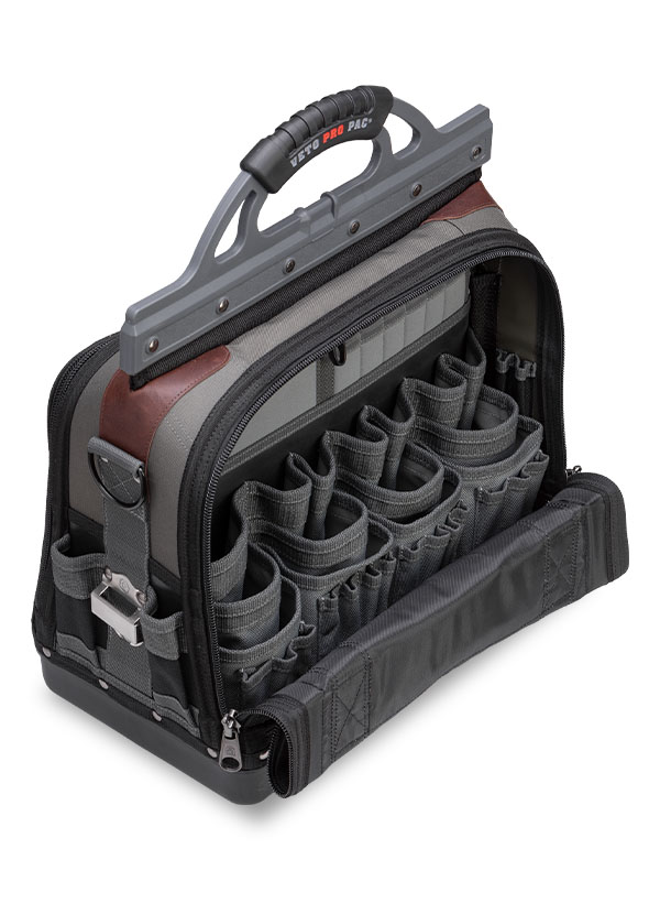 工具整理袋經過多項改進,更適合服務技術人員的工具收納和日常工作。 TECH-XL 工具包擁有 80 個口袋,空間充裕,可輕鬆收納手動工具、零件盒、儀表、無線衝擊鑽和其他大件物品。此外,還增加了 9 個小型氯丁橡膠口袋,用於存放鑽頭和鑽頭延長器。