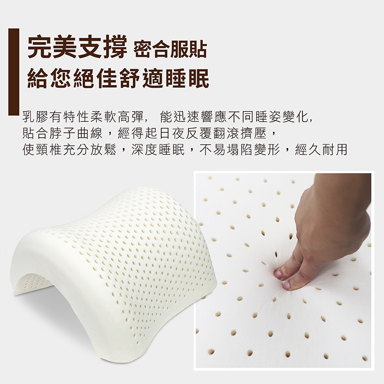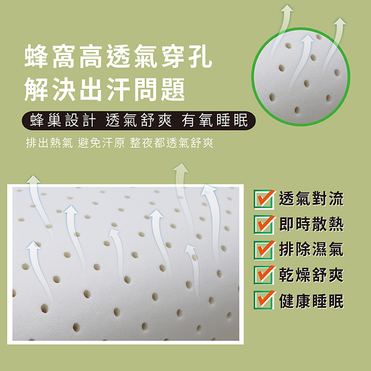 ﹝商品特色﹞★天然材質並有優於其他材料不易老化的優點。★防霉防菌,決不滋生病菌,同時表面清潔容易不易殘留汙穢雜質,故可以常保清潔★採用大面積透氣口設計,均勻排列,提供良好的透氣效果,不悶不熱★天然乳膠極佳之服貼性,使用壽命長,經濟實用★散熱快,易清洗、好保養★良好的支撐效果,讓您夜夜好眠