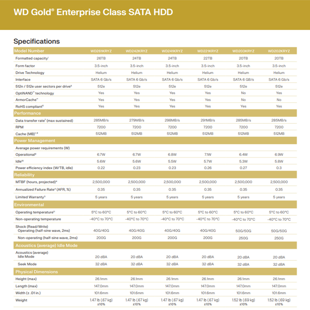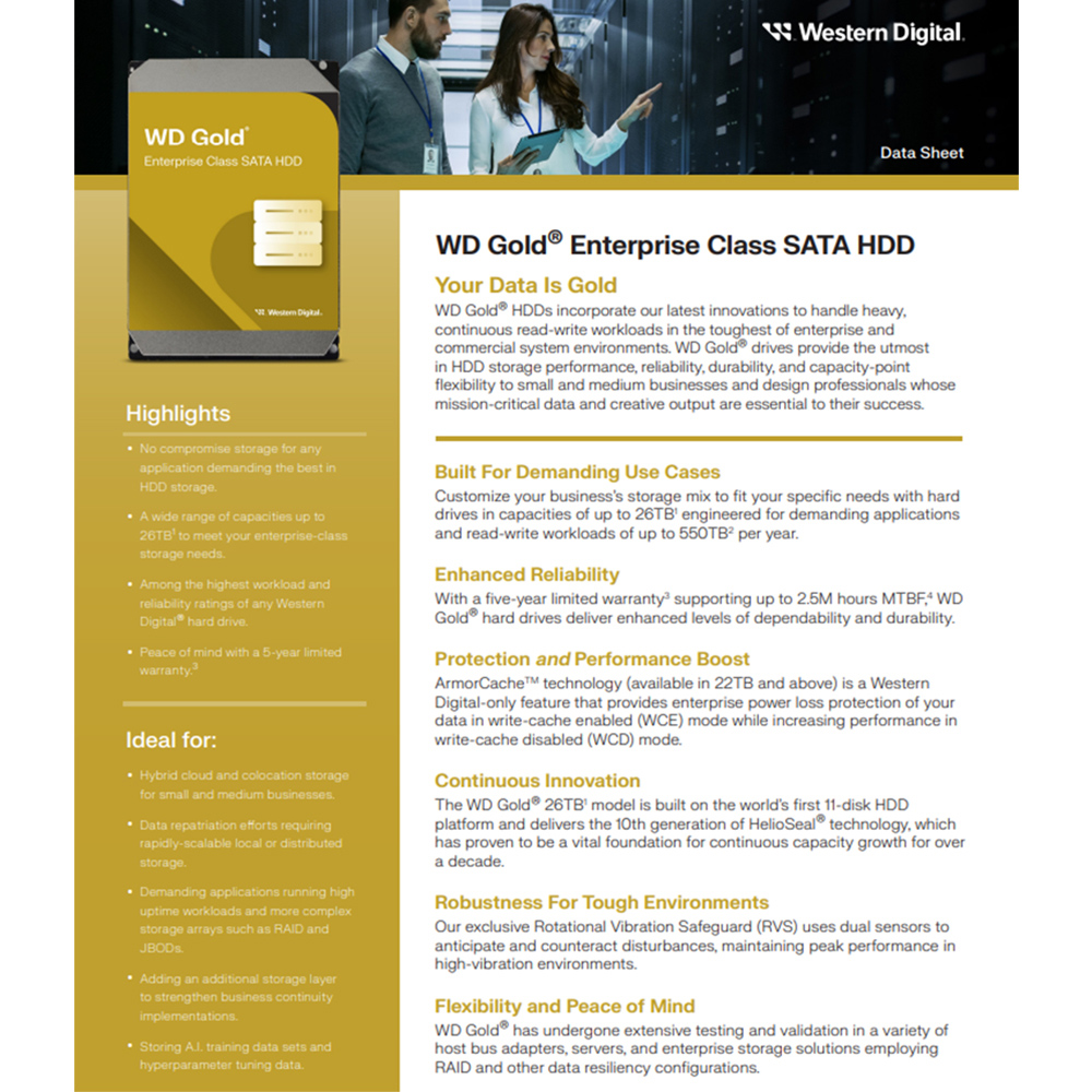 WD Gold 提供容量從 1TB 到 26TB1 的全面 SATA HDD 產品組合,可令您以自己的方式建立儲存空間,專為繁重的應用程式工作負載而設計,每年可處理高達 550TB2 的工作負載。