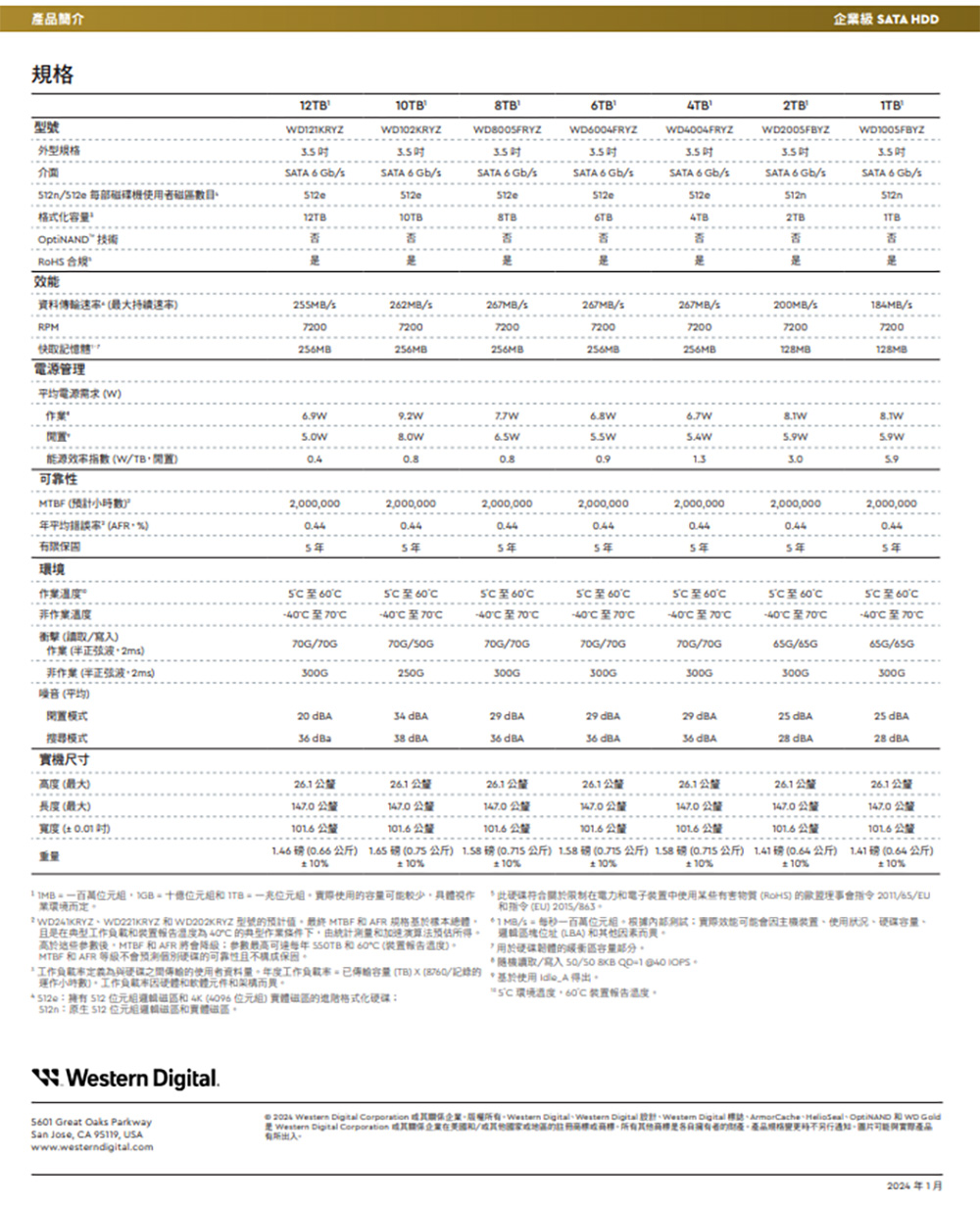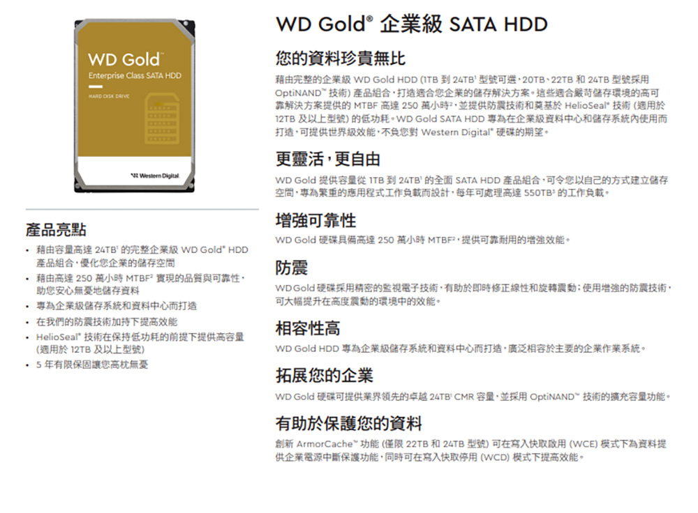 • 藉由容量高達 24TB1 的完整企業級 WD Gold®HDD產品組合,優化您企業的儲存空間
