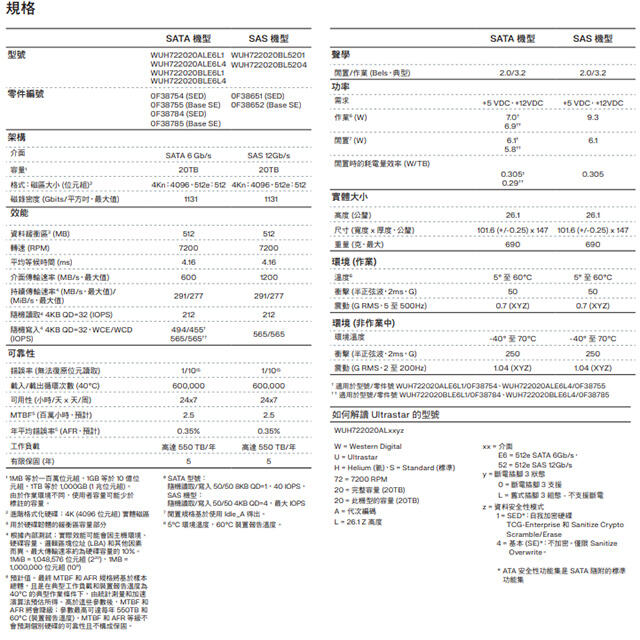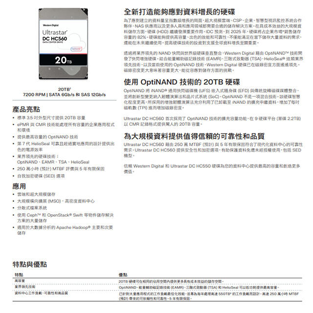 -標準 3.5 吋外型尺寸提供 20TB 容量-ePMR 與 CMR 技術能處理所有容量的企業應用程式和環境-提供最高容量的 OptiNAND 技術-第 7 代 HelioSeal 可靠且經過實地應用的設計提供出色的電源效率-業界領先的硬碟技術;OptiNAND、EAMR、TSA、HelioSeal-250 萬小時 (預計) MTBF 評價-自我加密硬碟 (SED) 選項