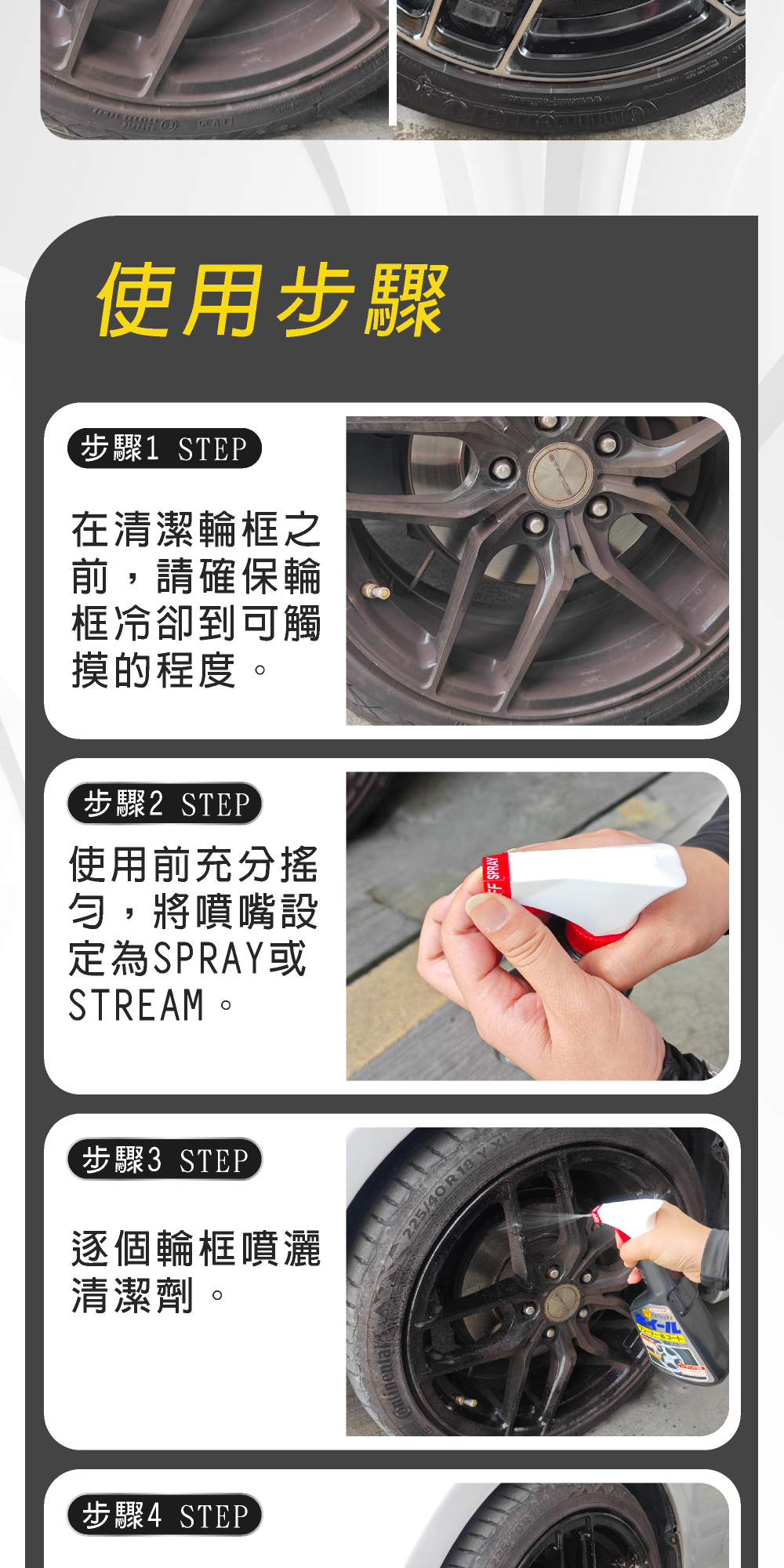 ‧噴灑、刷洗、沖洗三步驟,輕鬆完成清潔保護,輪圈煥然一新。