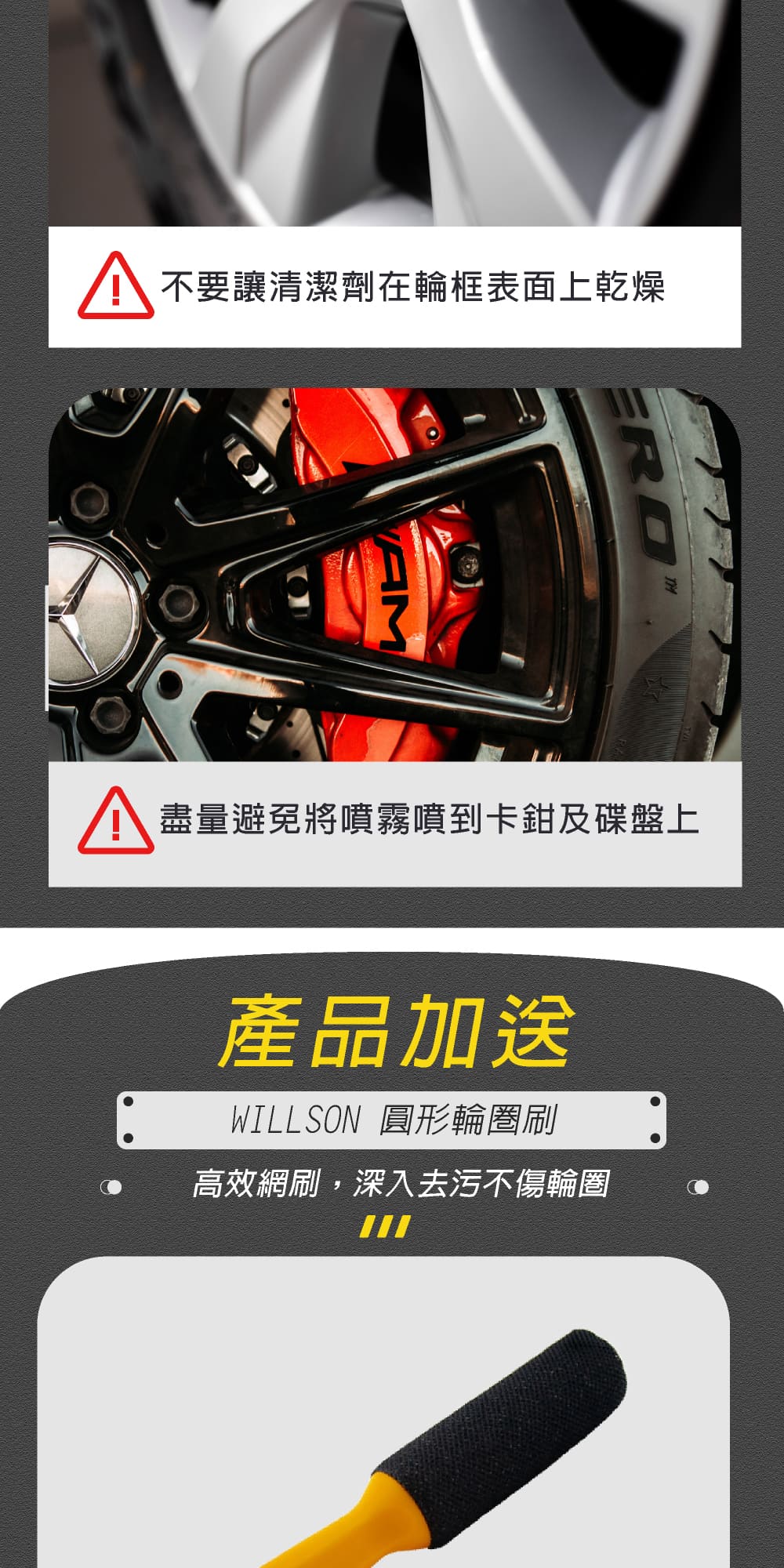 ‧附贈圓形鋁圈刷搭配清潔劑,徹底去除煞車粉塵、油污及頑固髒污。