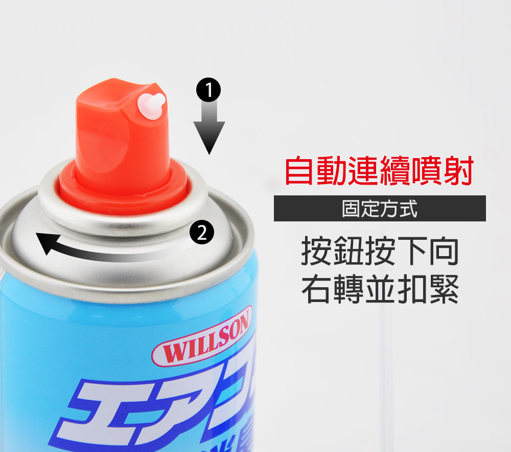 自動連續噴射1.啟動汽車引擎,讓期怠速運轉。2.開啟冷氣開關,用室內循環,風速調至最大。3.使用前請先搖勻,將按鈕按下向右轉並扣緊。4.等候約3-4分鐘讓氣體全部噴出在空調系統循環。5.循環約10分鐘後再將空罐移出。馬上了解→遠離病菌的孳生,汽車內裝清潔保養不能少
