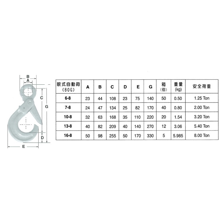 WIN 眼式自鎖鉤系列 共有三種型式 下標請選擇正確喔因重量因素 所以不能超商喔6-8=1.25T7-8=2T10-8=3.2T13-8=5.4T16-8=8T都有通過CNS檢驗合格可以安心使用投保國泰產物保險1500萬
