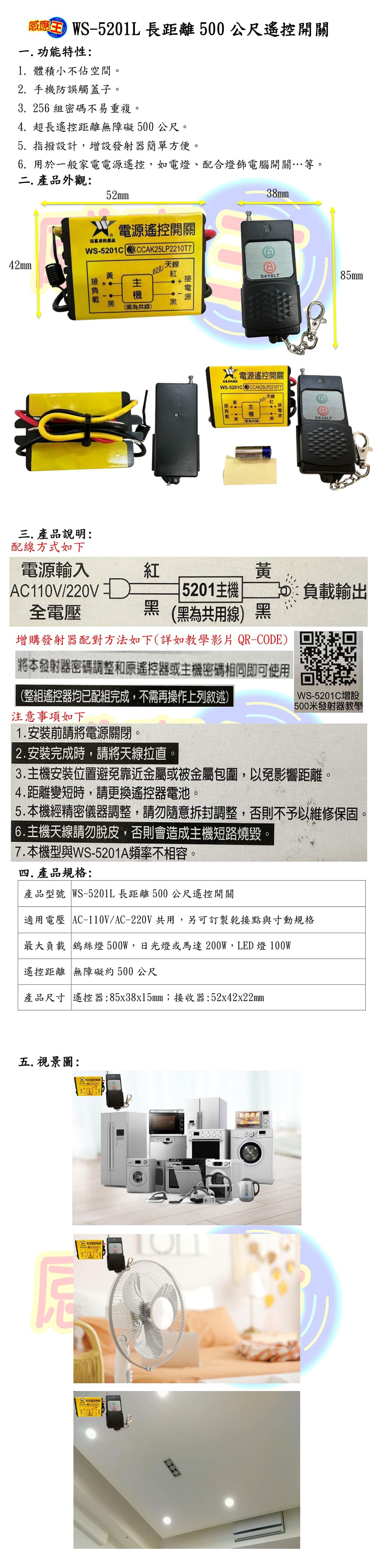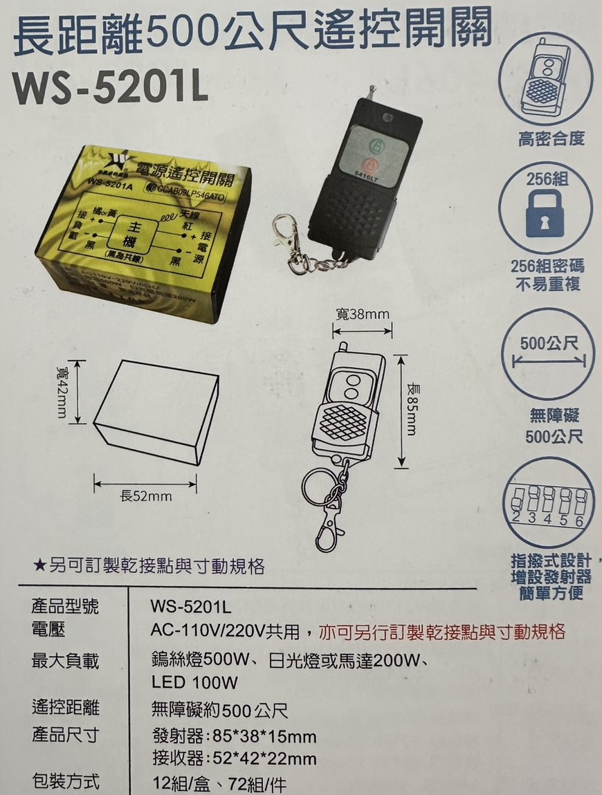 (感應王照明)【伍星】WS-5201L長距離500公尺遙控開關【遙控距離500公尺-可增設發射器-全電壓-台灣製造】