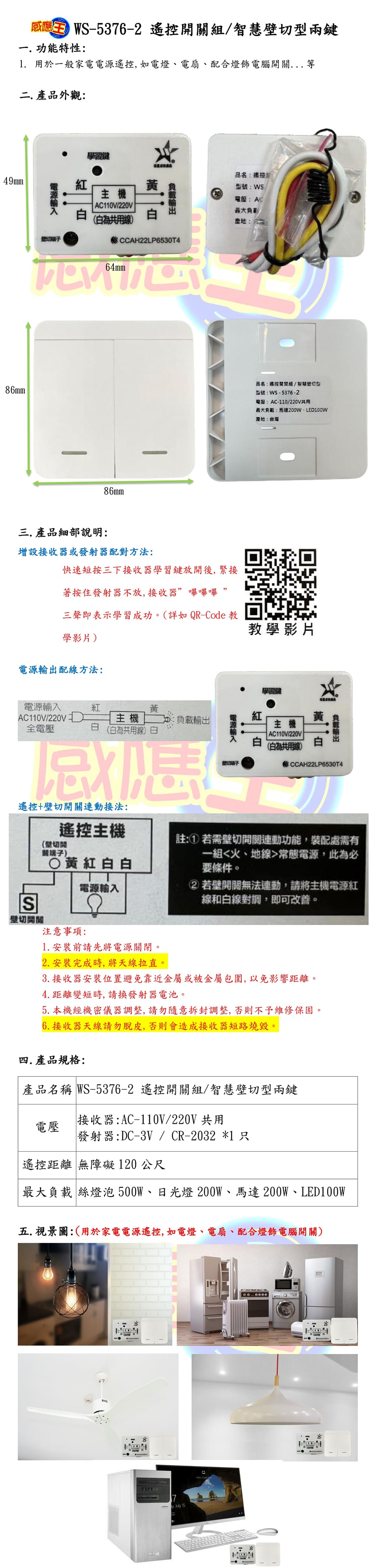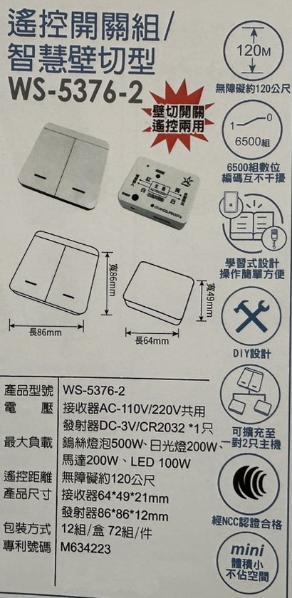 (感應王照明)【伍星】WS-5376-2遙控開關組/智慧壁切型兩鍵【遙控距離120公尺-可增設發射器-全電壓-台灣製造】
