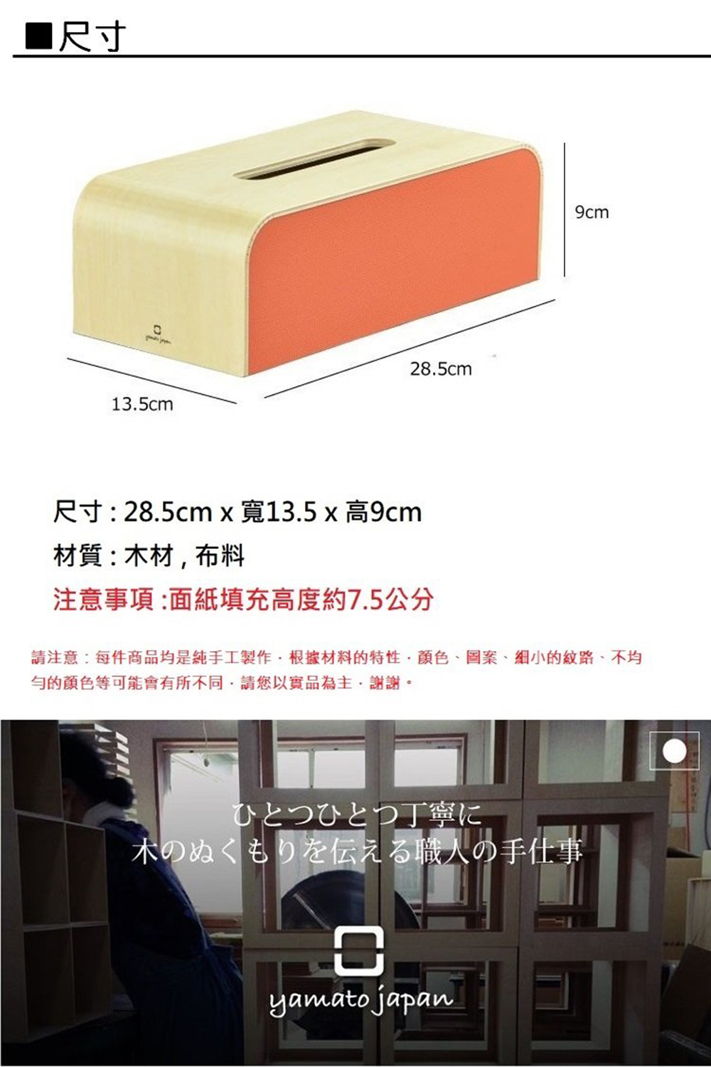 使用生長在潔淨的水和大自然中的木材每個木材都是精心挑選而出,木匠們用著傳統與現代的技術及純手工製作成許多與我們日常生活息息相關的周邊用品。每件商品都是獨一無二的。yamotojapan希望透過木製商品的柔和感與溫暖為顧客帶來更舒適的生活品質一般家庭 都會有使用面紙的時候 但往往會忽略到,好的面紙盒也會點綴出不一樣的生活質感COLOR BOX 可以輕易地如入每個角落 溫柔的配色搭配上木頭的質感,並不會顯得特別突兀 在日本福井縣所製造出來的高品質木製商品 以高質感的技術及搭配北歐風格的畫風讓木製面紙盒瞬間輕易的融入居家生活裡 喜歡木質溫暖質感風格的你/妳 ,COLOR BOX 可以滿足你的需要 簡單無多餘的設計 讓我們補充或收納面紙都簡單方便尺寸:大約寬度28.5×深度13.5×高9 (cm)重量:約0.36公斤材質:木材原產國:日本製造請注意:每件商品均是純手工製作,根據材料的特性,顏色、圖案、細小的紋路、不均勻的顏色等可能會有所不同,但是所有產品均由製造商檢查後發貨,請您以實品為主,謝謝。