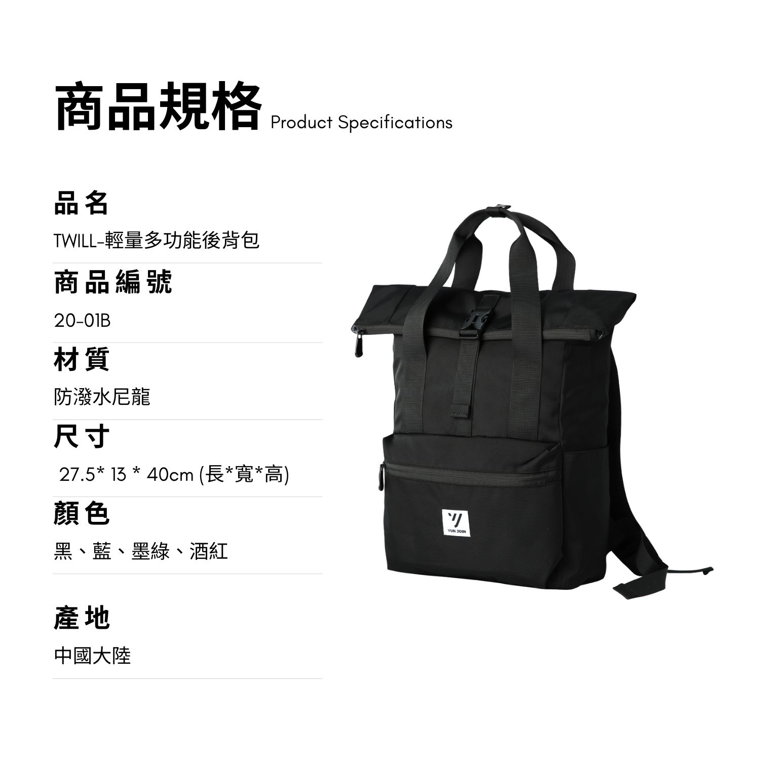感謝各位蒞臨 YUNJOIN本賣場公司現貨供應且隨訂單開立電子發票合法登記營業之店家,安全品質有保障【產品介紹】簡單輕量設計,內層收納功能紮實讓你一個包應付各種場合休閒、旅遊、上班、學生皆可使用★超多收納隔層、緩衝背墊、加固車縫★多情境可使用、極輕量【產品規格】●材質:防潑水尼龍布精選滑順手感尼龍布料經特殊壓紋及表面塗層處理。使 TWILL系列包款兼具 柔軟、質輕、強韌性、防潑水及表面光澤的特點。●結構:後背包●尺寸:27.5 x 13 x 40 cm27.5 x 13 x 50 cm (全展開) (長x寬x高)●重量:650g●顏色:黑色、藍色、軍綠、酒紅尺寸及顏色皆以實物為準※尺寸為手工測量,會因布料彈性、測量起點等因素略有誤差,誤差尺寸±2cm為國際驗貨標準可接受範圍。※商品圖檔顏色因電腦螢幕設定及攝影光線會有所不同,以實際商品顏色為準。#YUNJOIN #YUN JOIN#後背包 #通勤背包 #旅遊背包#旅行 #休閒 #上班族#防潑水 #輕量 #抗皺 #耐磨 #素面 #簡約 #開學季 #情人節 #禮物 #後疫情────────────────────────────────────────────────【客服】線上快速諮詢有問題歡迎詢問,專人在線為您服務。若有任何問題或是收到商品時發現異常,可拍照片傳至聊聊客服人員上班時間會馬上為您處理。服務時間:週一至週五09:00~18:00