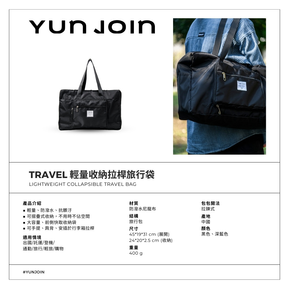 可加購多樣旅行配件, 一次購足更划算~【產品規格】特色:可收納摺疊,方便攜帶材質:防潑水尼龍尺寸:45*19*31 cm (展開)24*20*2.5 cm (收納)重量:400 g結構:可插拉桿旅行包顏色:黑色、深藍色#拉桿包 #旅行 #出遊 #防潑水 #耐用 #質感 #收納 #收納包