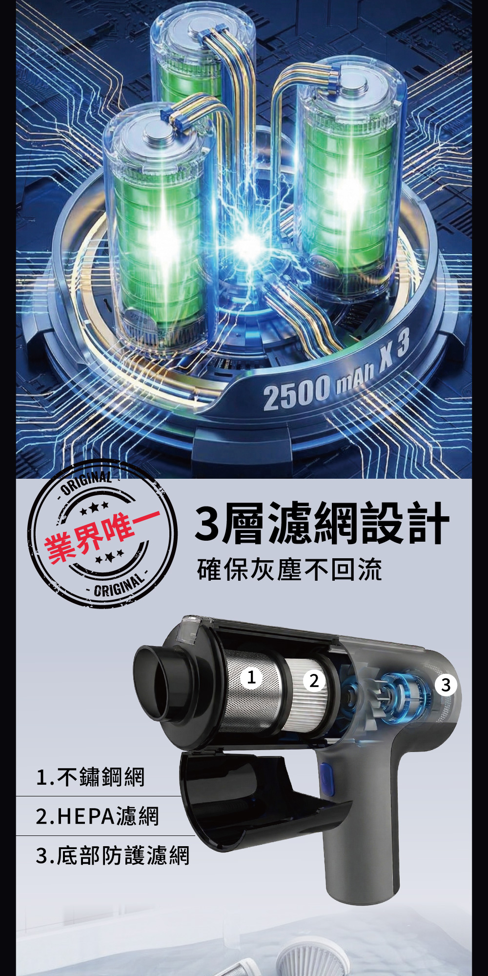 .採用3道濾網設計(不鏽鋼網+HEPA濾網+底部防護濾網),確保灰塵不回流。