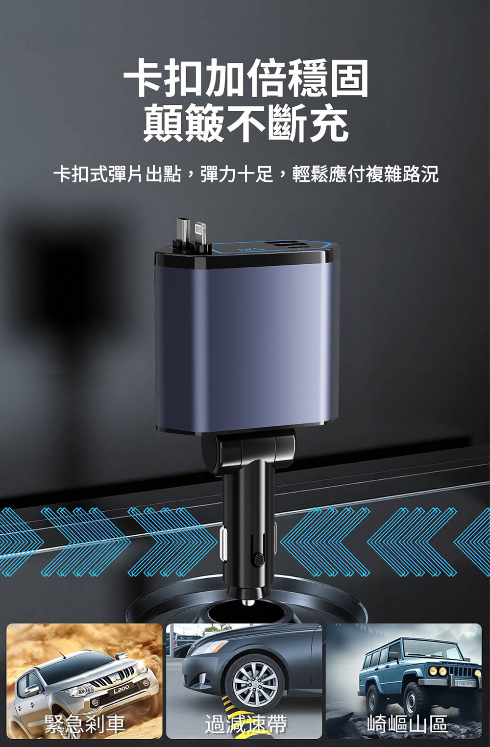 .卡扣加倍穩固顛簸不斷充:卡扣式彈片出點,彈力十足,輕鬆應付複雜路況