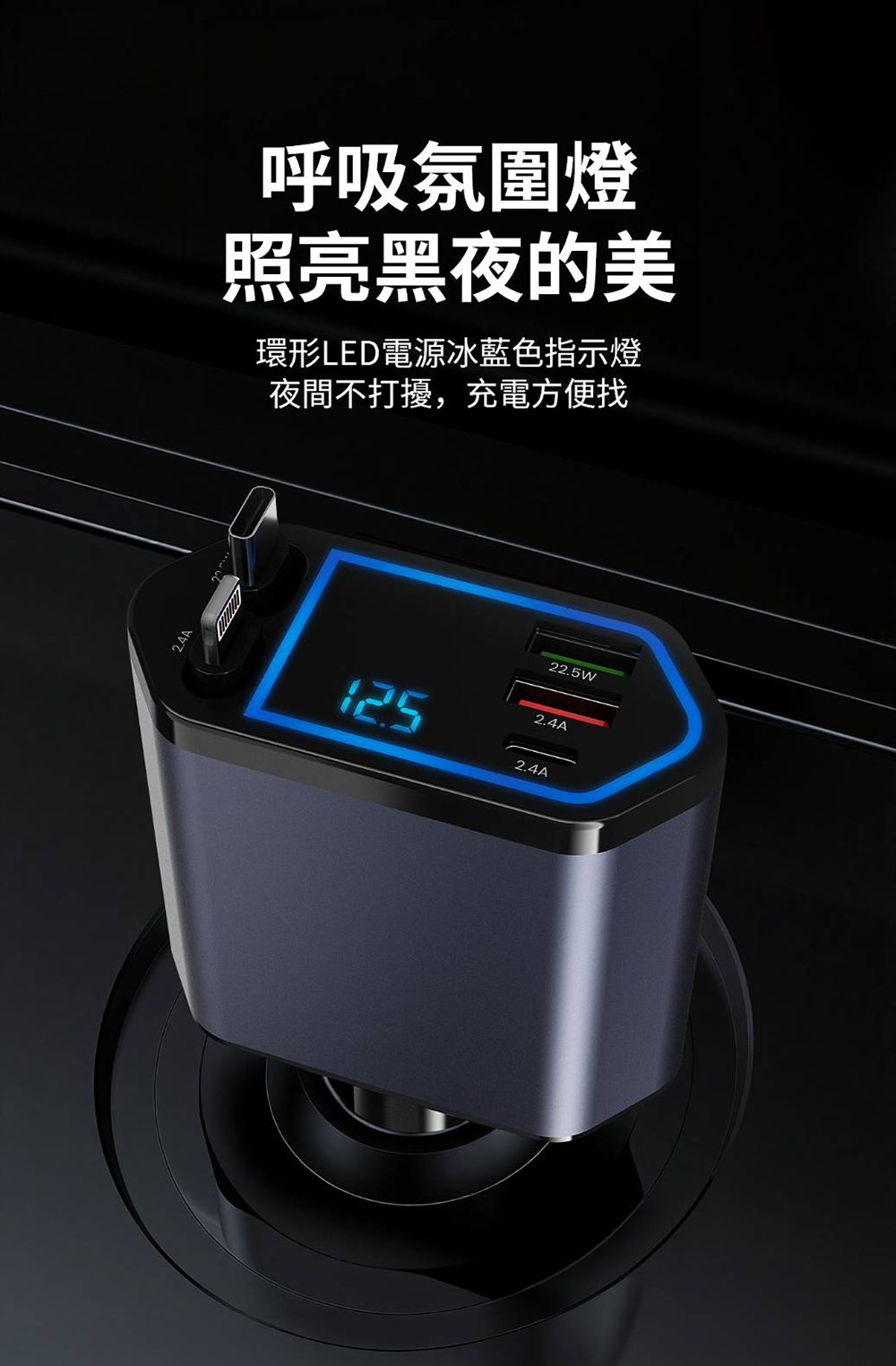 .LED氛圍燈:環形LED電源冰藍色指示燈,夜間不打擾、充電方便找